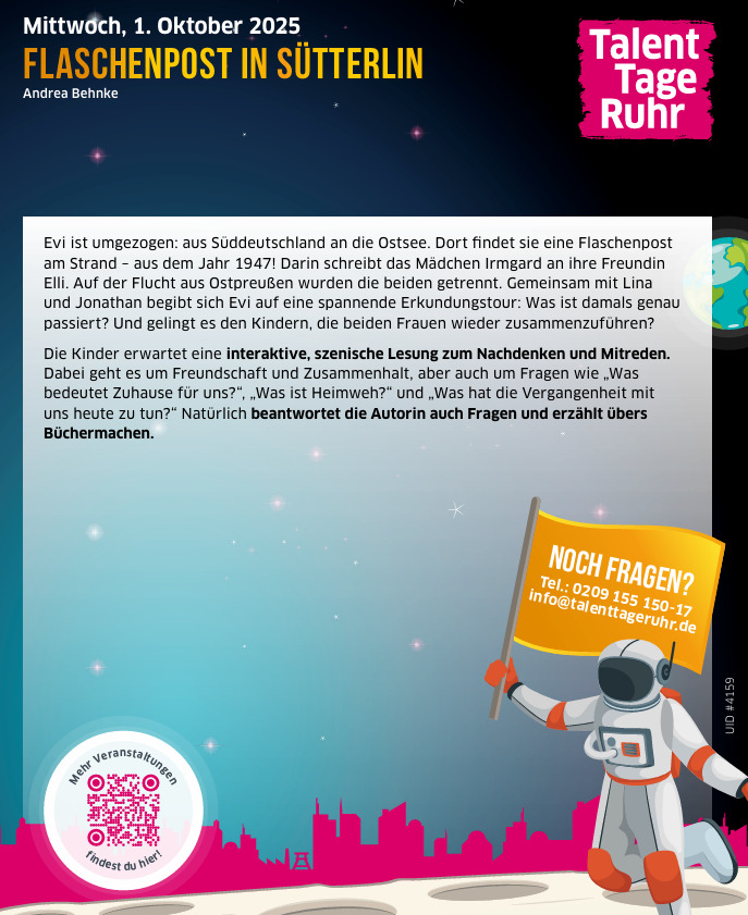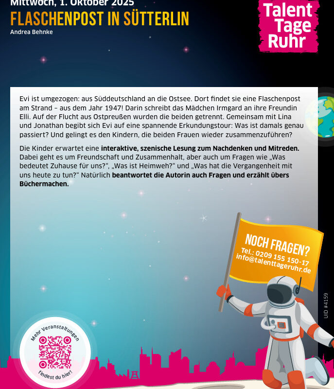 Im Rahmen der diesjährigen Talenttage Ruhr nahmen am Mittwoch, dem 01. Oktober 2025, die Klassen 5b und 6a jeweils an einer Lesung mit der Jugendbuchautorin Andrea Behnke teil. Frau Behnke las den interessierten Schüler/-innen aus ihrem Buch „Flaschenpost in Sütterlin“ vor. Und das nicht irgendwo, sondern direkt im Klassenraum. Viel näher kann man als Schüler einer echten Autorin wahrscheinlich gar nicht kommen.