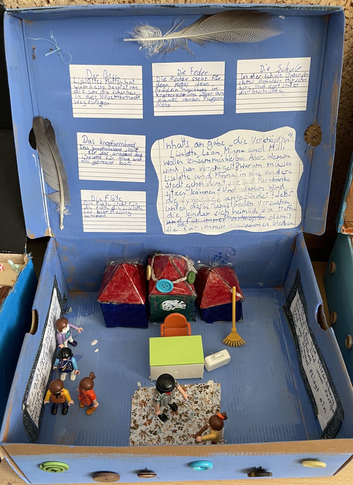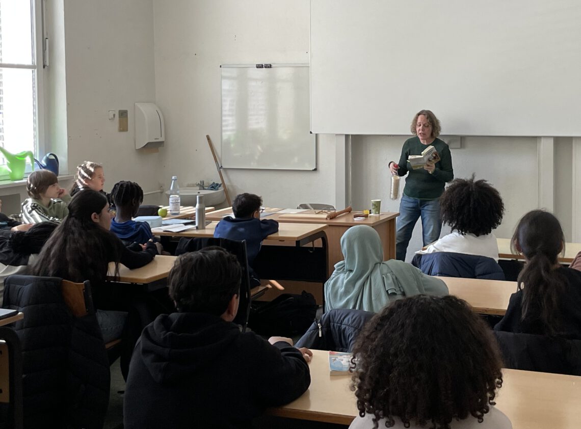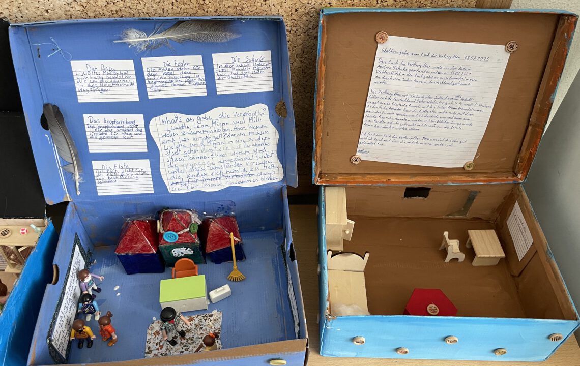 Frau Behnke war der Klasse 6a auch schon bekannt, denn im Deutschunterreich wurde bereits ein weiteres Werk der Autorin gelesen, nämlich das Buch „Die Verknöpften“. Im Zusammenhang dieser Unterrichtsreihe gestalteten die Schülerinnen und Schüler individuelle Lesekisten, die noch immer den Klassenraum der 6a verschönern. Auch Frau Behnke zeigte sich von den Lesekisten beeindruckt.