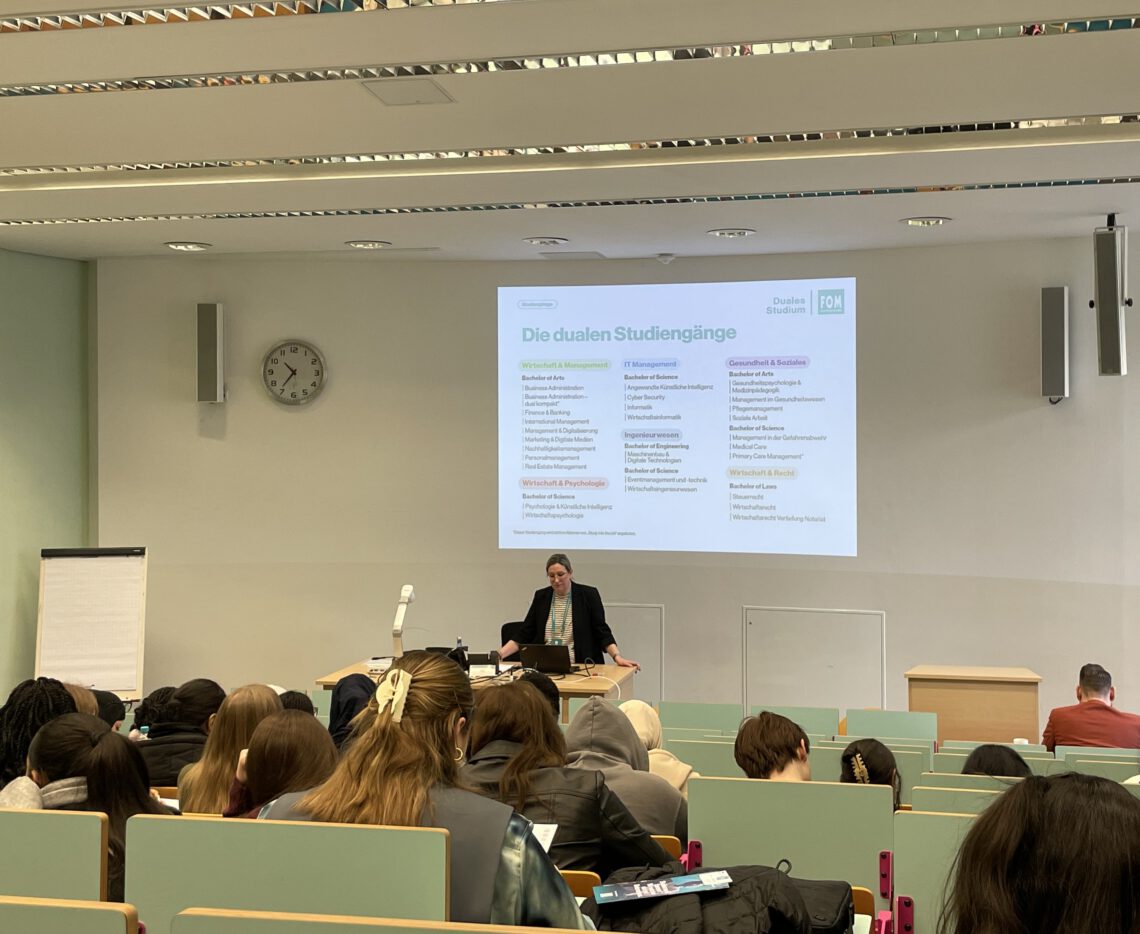 Am 03.02.2026 hatten die Schülerinnen und Schüler der Q1 die Gelegenheit, das Hochschulzentrum der FOM-Hochschule für Ökonomie und Management in Essen zu besuchen und dort Probe-Vorlesungen mitzuverfolgen. Die FOM ist eine private, staatlich und international anerkannte Hochschule mit Hauptsitz in Essen, die vor allem praxisorientierte Studiengänge für Berufstätige, Auszubildende und Abiturienten anbieten – darunter auch in wirtschaftlichen Fächern wie Marketing und Medien.